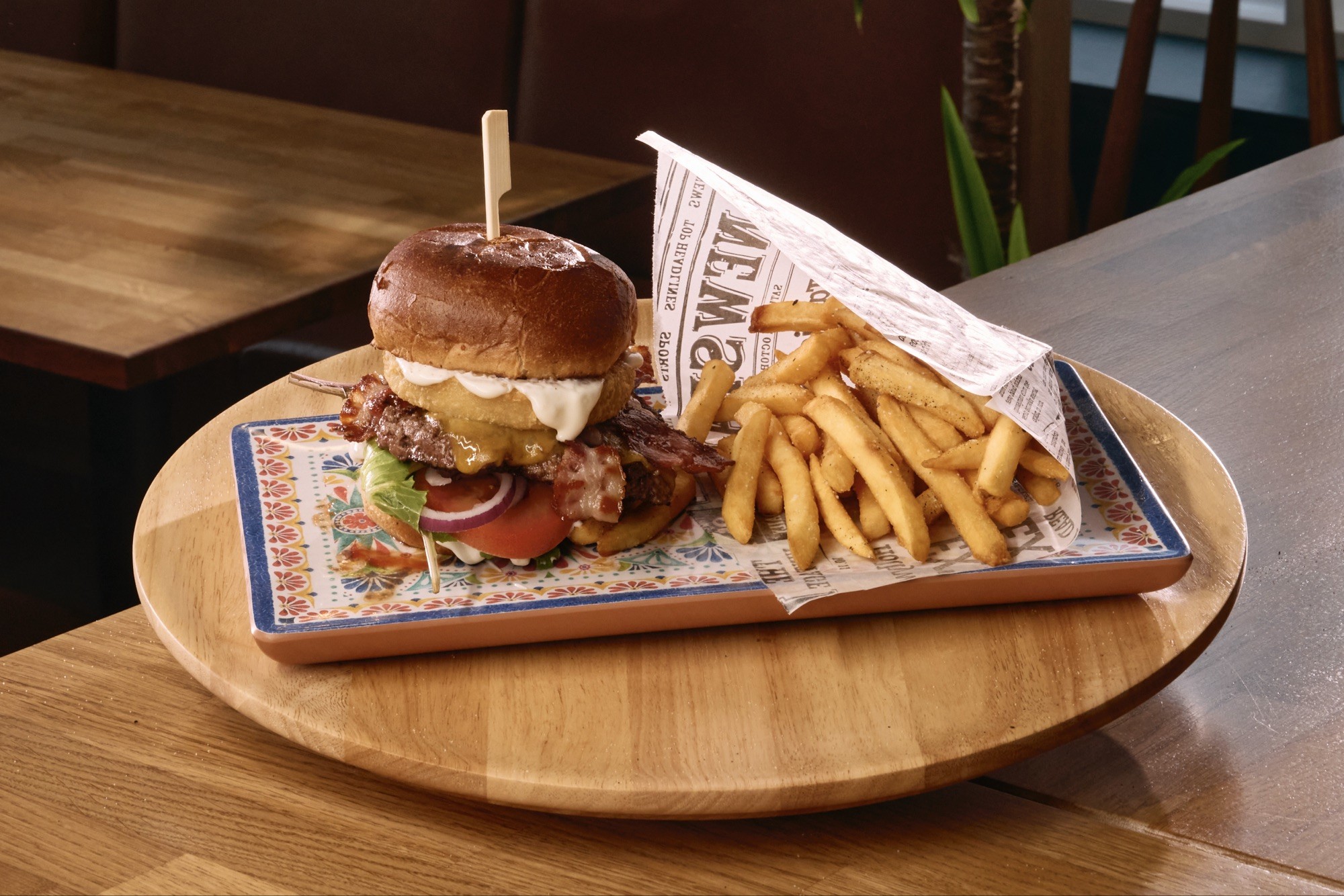 Brioche bolli, 200 g. av góðum malnum kjøti, cheddarostur, reyðleykur, stoktir soppar, salatmix & tasty kilidressingur