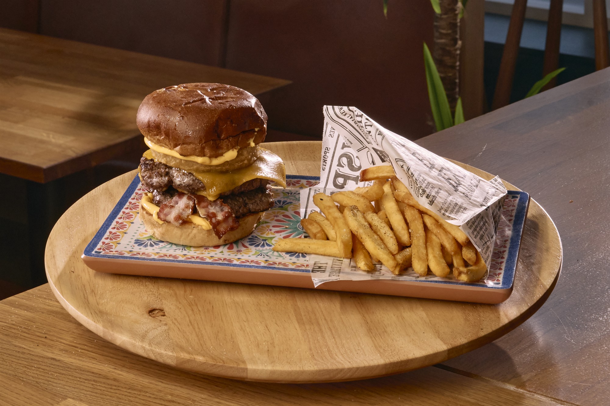 Brioche bolli, Angus neyta burgari 200 g, heimagjørdur aioli dressingur, leyk ringar, tomat, salatmix, cheddar ostur, stokt bacon