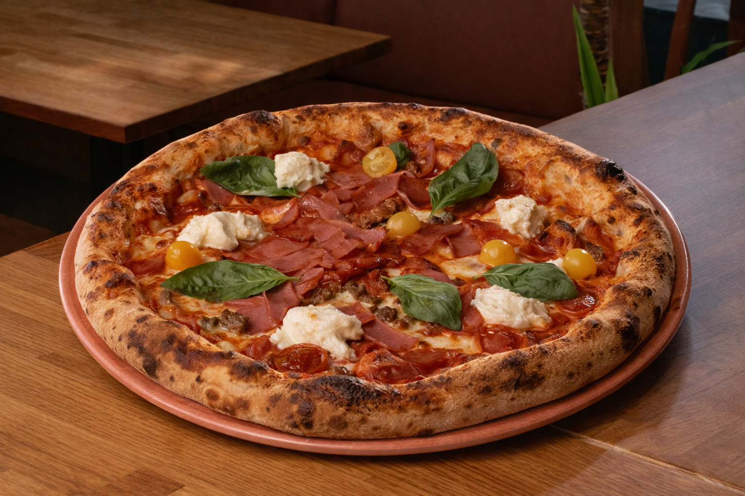 Tomatsós, rivin mozzarella ostur, skinka, chorizo, neytakjøt